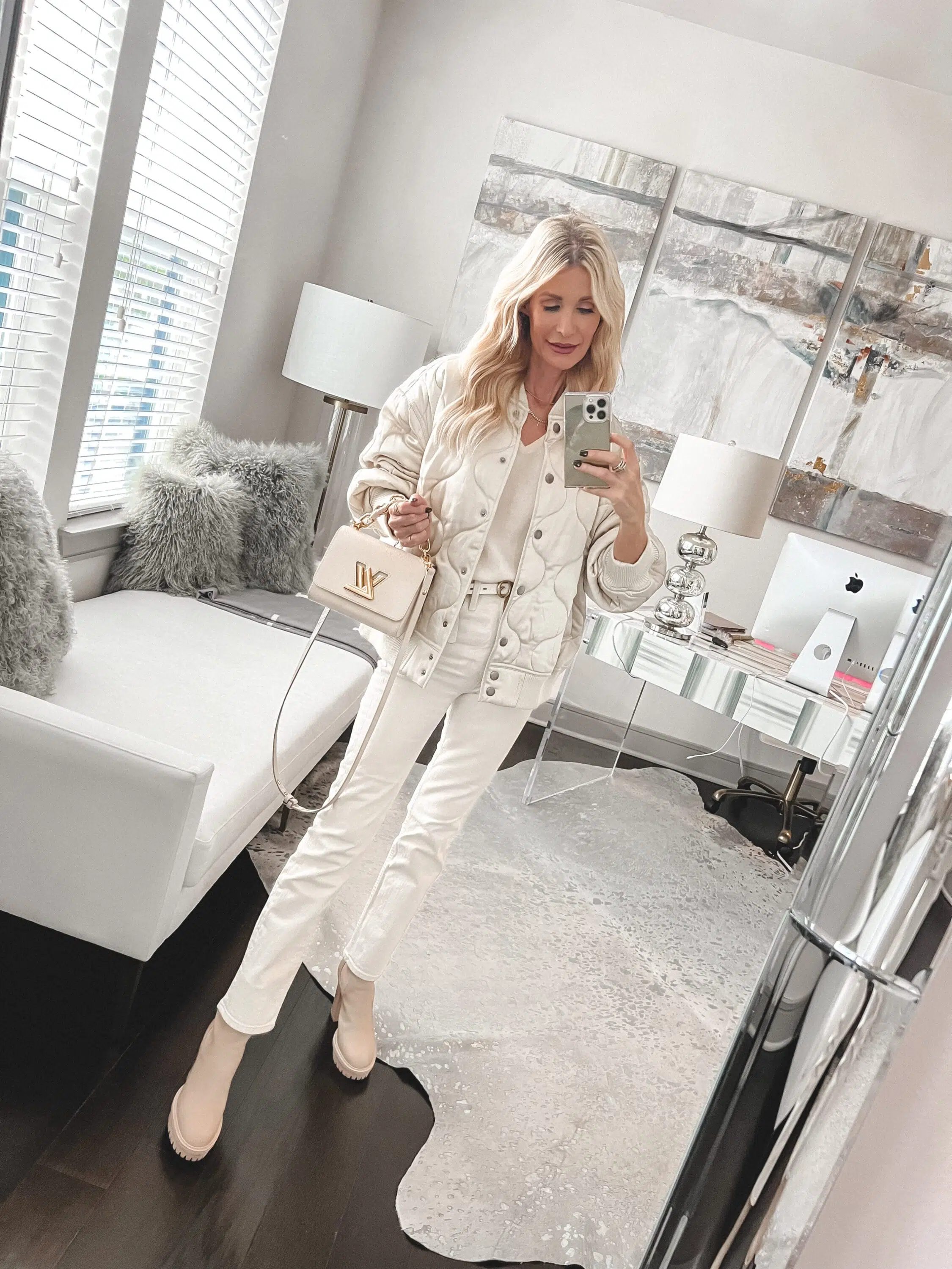 An alternative choice to the quilted bomber jacket above would be this faux fur & faux leather moto jacket from BLANKNYC. This style of jacket is the “It Jacket” for fall 2023 and I love the all-white design choice making it perfect for a chic winter white look. I wear an XS and it fits true to size.