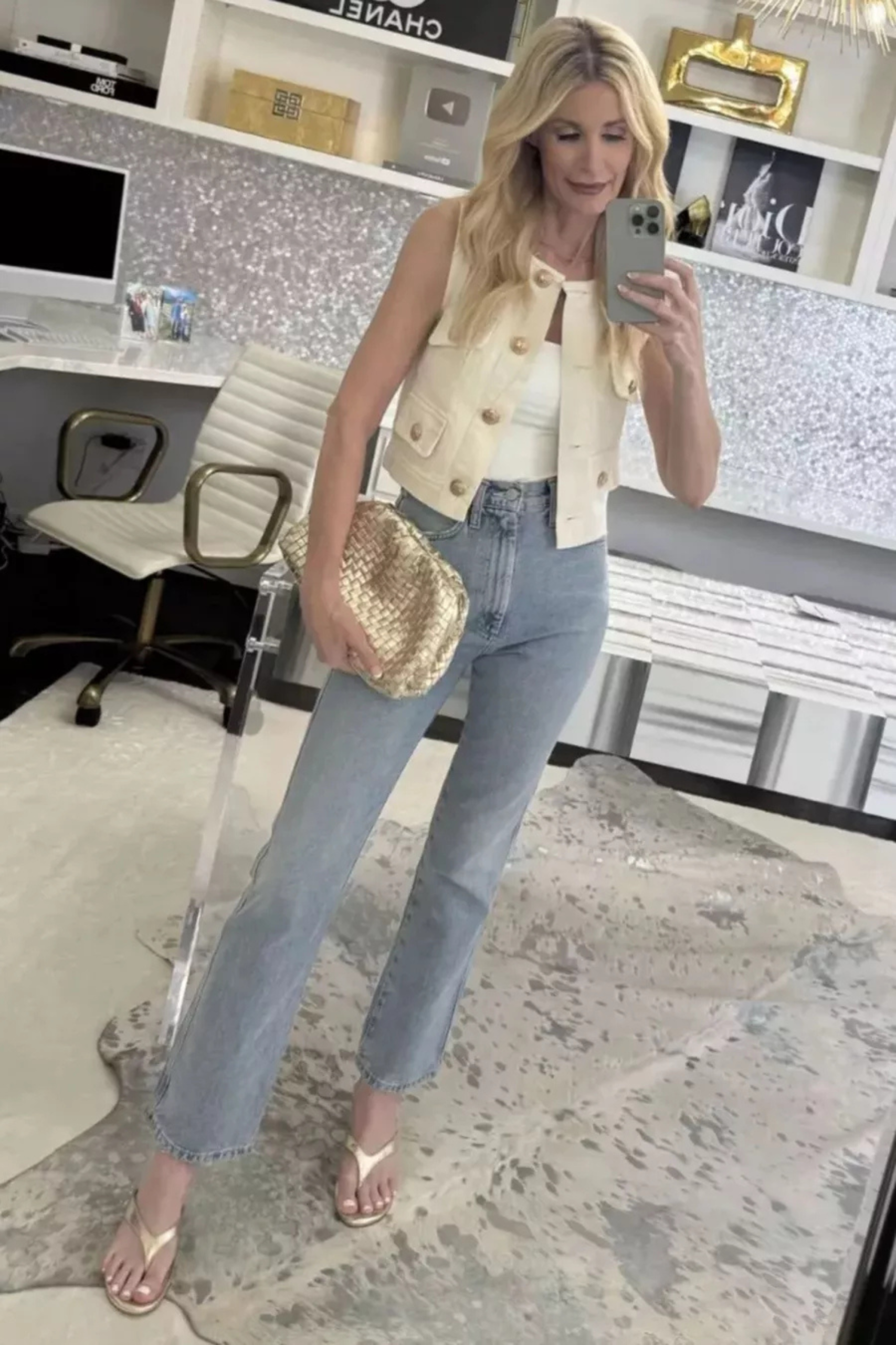 IVORY VEST (XS) // JEANS (24) // KITTEN HEELS – FOR LESS // HANDBAG