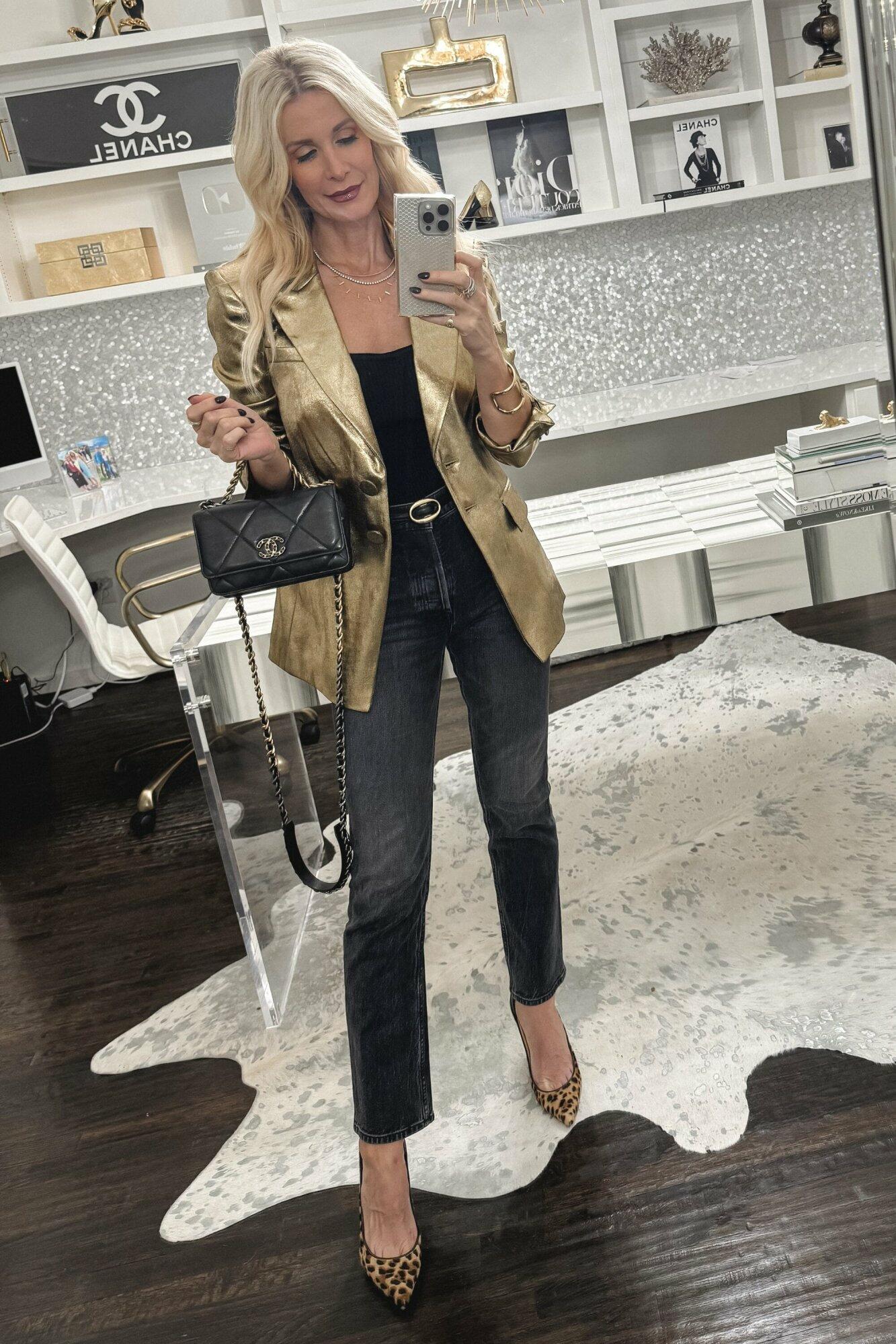 My final outfit featuring the same gold-tone blazer shows it styled with one of my all-time favorite pairs of jeans. These incredibly flattering jeans from Agolde are perfect for showing off your favorite pair of footwear. I love the edgy black wash and the high waist makes them super flattering. I wear a size 24 and I’d stick with your regular size for the best fit!