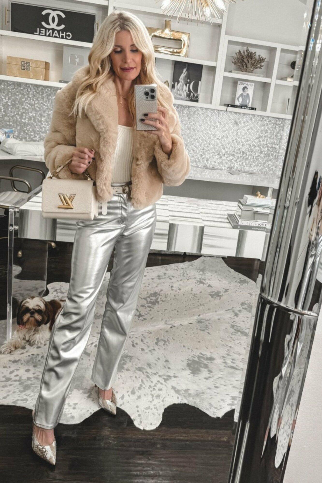 FAUX FUR JACKET (XS) // RIBBED TOP (XS) // METALLIC PANTS (24) // HEELS // HANDBAG – FOR LESS