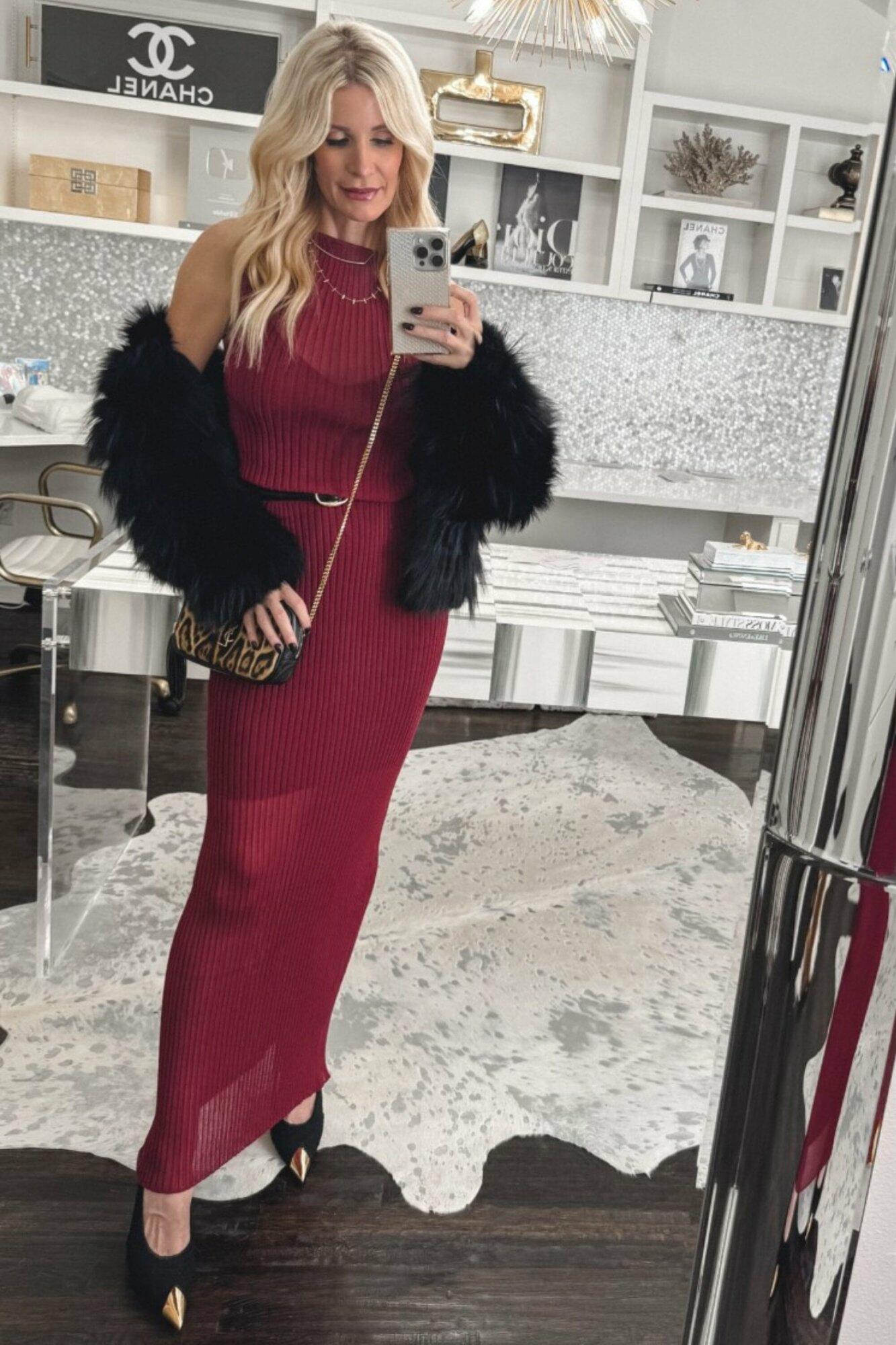 My next stylish holiday outfit features this sleek knit maxi dress from Mango. It is the ultimate blend of comfort and style, and it just so happens to come in a trending emerald shade as well! I love how the fitted silhouette highlights your shape while the soft knit fabric makes it look far more expensive than it really is. Not only does it fit like a dream and is wrinkle-free, but it also has a price point under $80! I wear an XS in this gorgeous dress and it fits true to size.