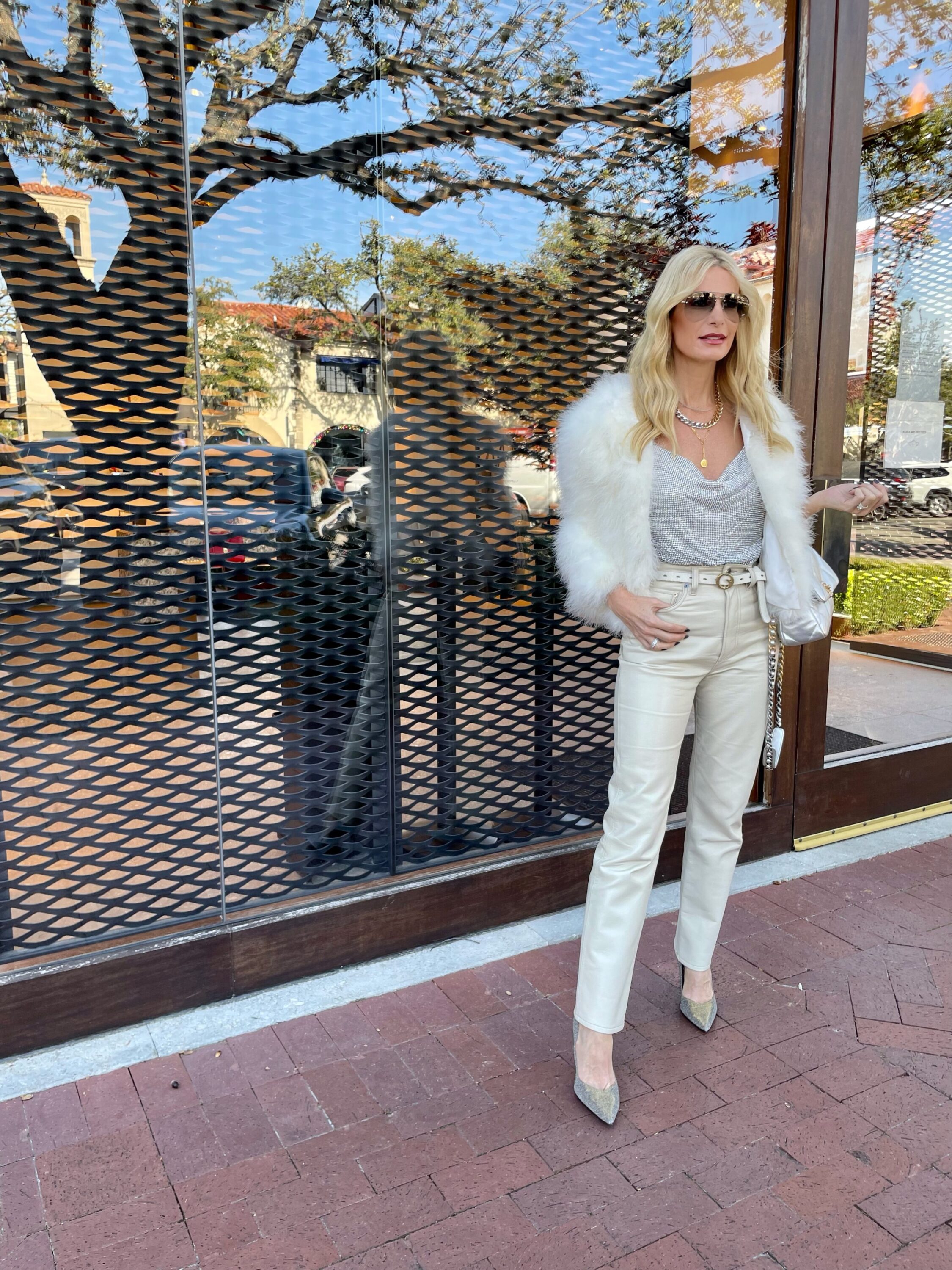 Always add 1-2 HERO pieces to your outfit and keep everything else in your look minimal. For example, in look one, my hero pieces would definitely be my fabulous feather jacket layered over my fun rhinestone camisole. My pants and heels are very simple as is keeping everything in my look similar tones which created a beautiful monochromatic winter white ensemble perfect for the holidays!