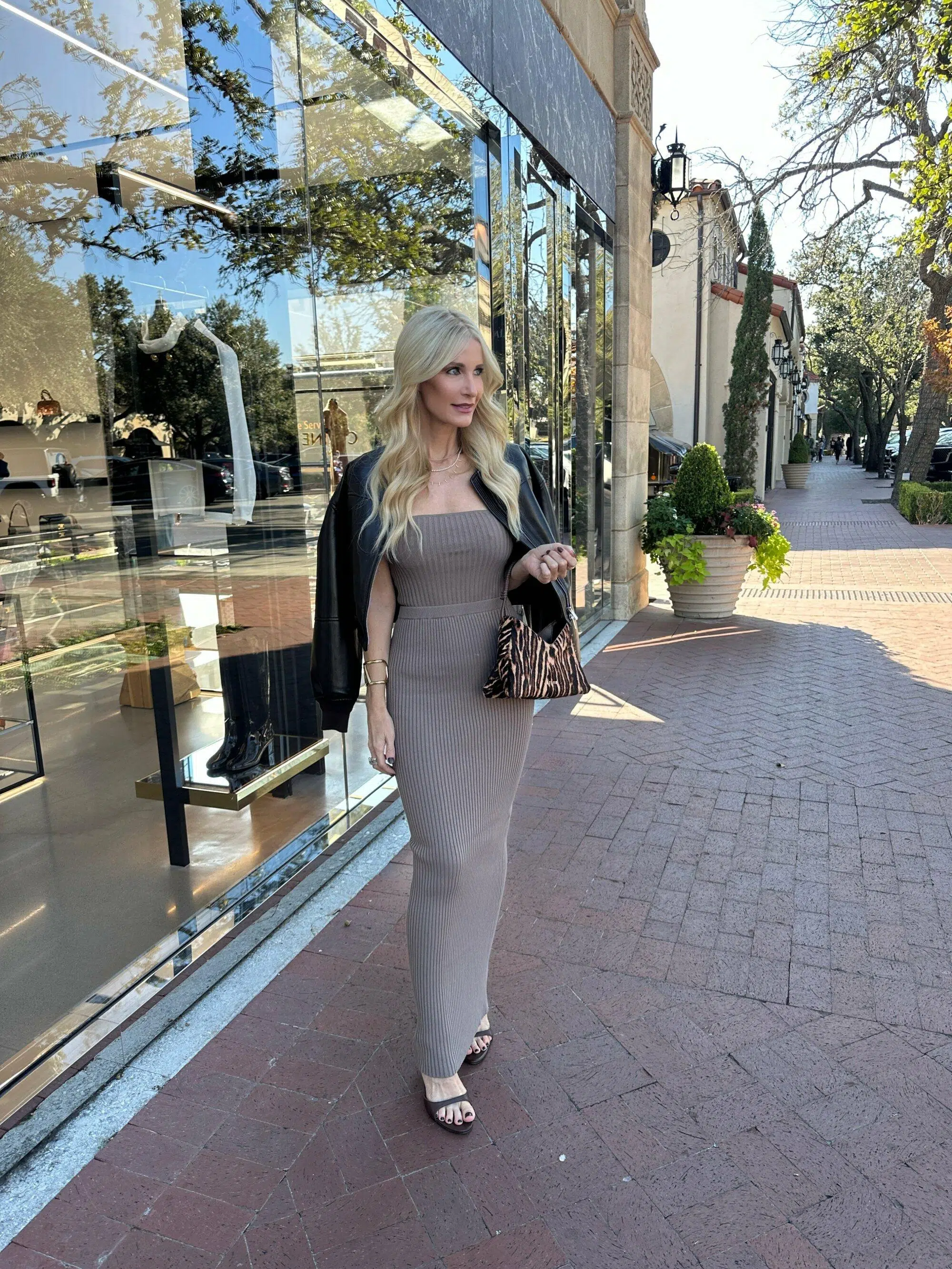 Dallas fashion blogger wearing a matching taupe skirt and top with a dark brown leather bomber jacket and kitten heels with an animal print handbag.