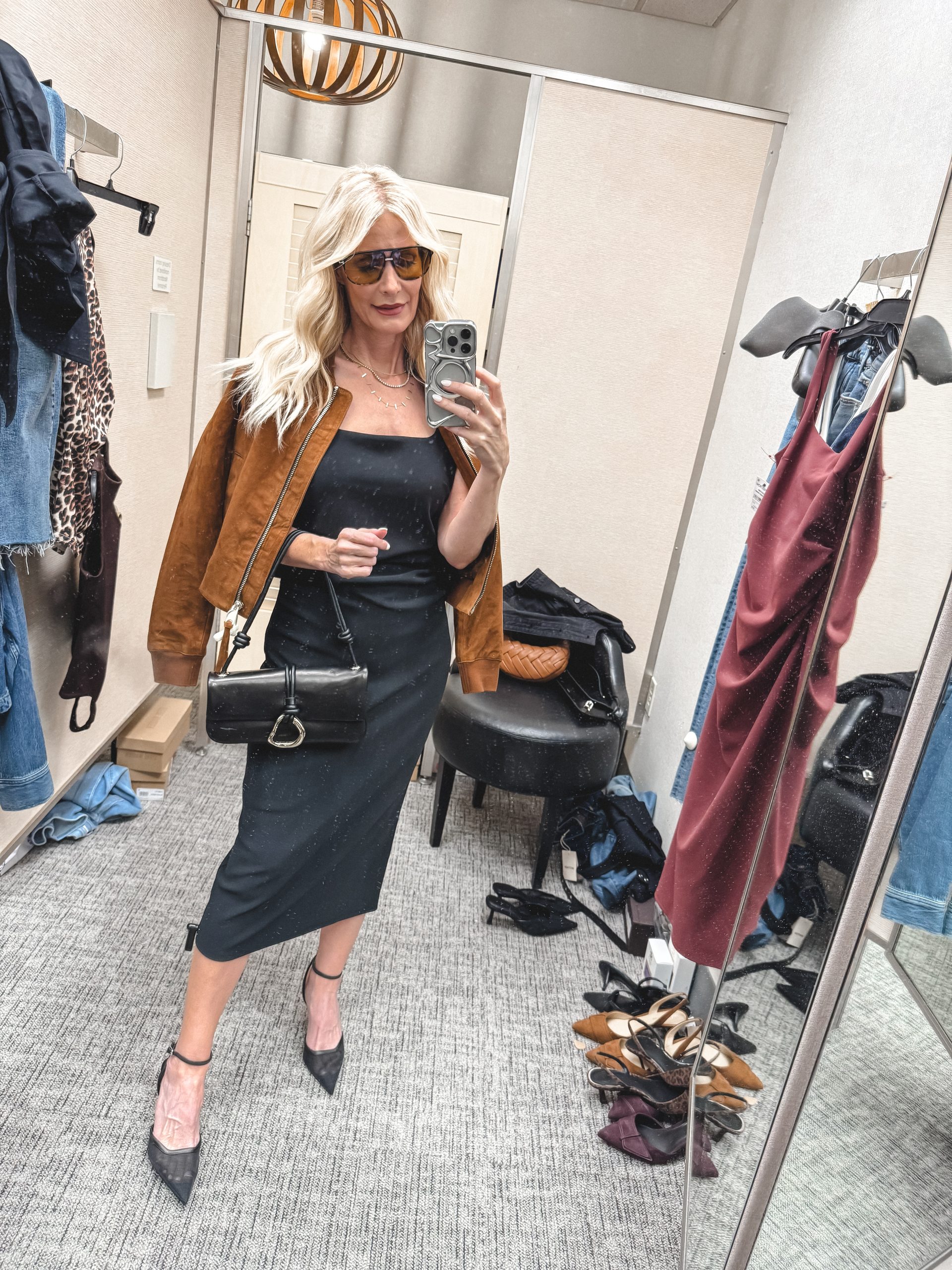 SUEDE JACKET (XS) // MIDI DRESS (XS) // MESH HEELS // SIM HANDBAG // SUNNIES