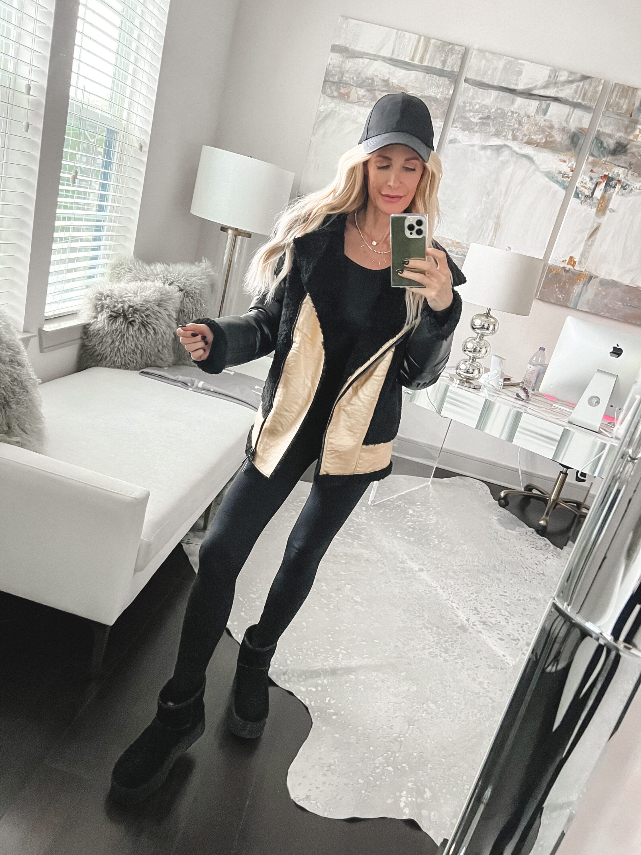 Next on my list of the ONLY Black Friday Sales worth shopping in 2023 is this stunning black & gold jacket. It’s 50% off in the LTK app and you can also use code SOHEATHER for a further 20% off! I love how it can be easily be dressed up with a pair of faded black jeans ( these are on major sale) and boots or it can be dressed down just like I have above with leggings and platform booties. I wear an XS in the versatile jacket and it fits true to size.