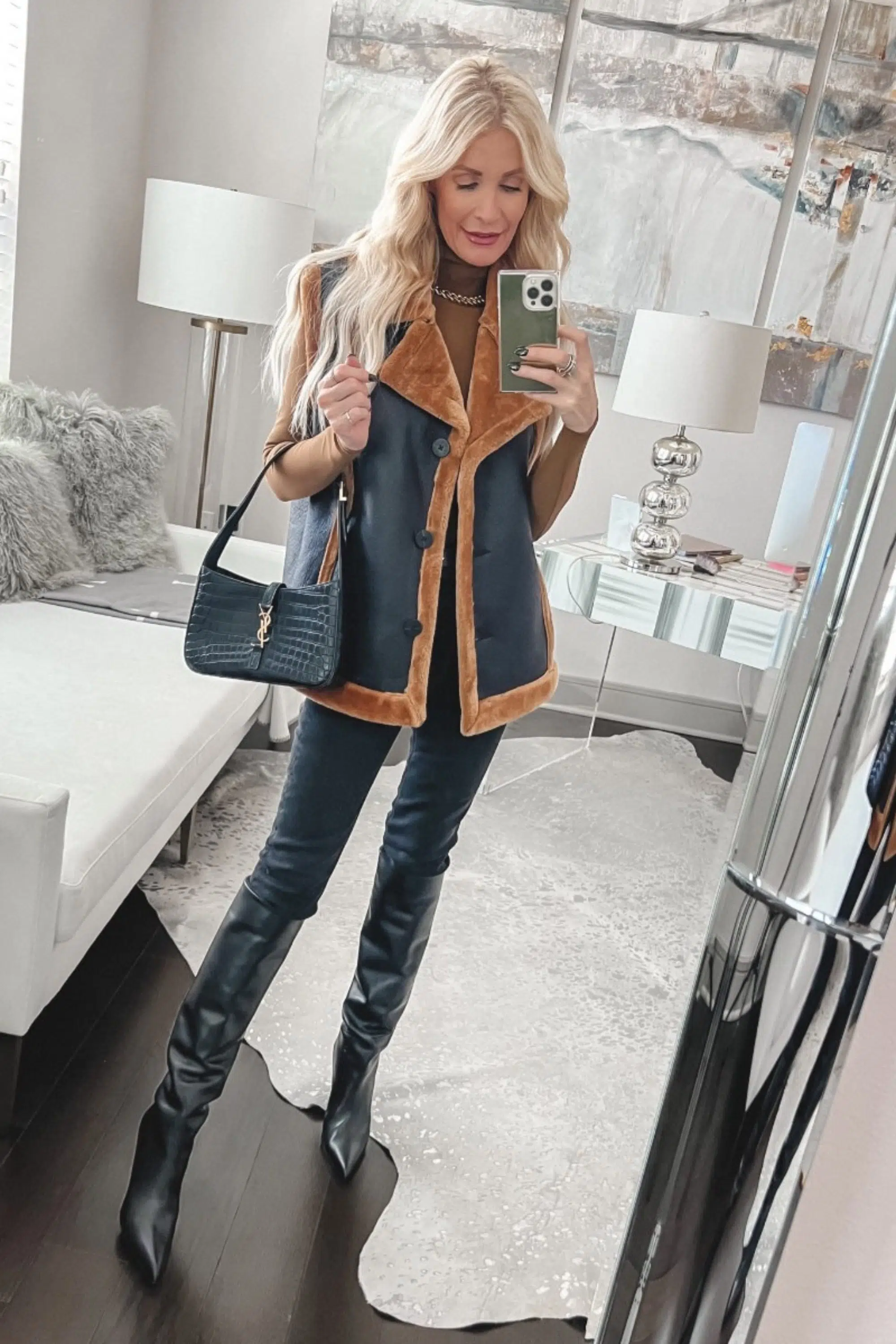 This first look showcases this amazing vest by French Connection. Stay cozy without compromising on style in this faux-leather vest trimmed with supersoft faux fur that is 40% off, making it well under $100. You can never go wrong with camel and black and certainly not at this price point! I wear an XS and it fits true to size.