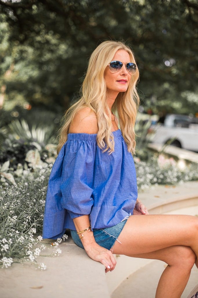 A good pair of denim cut-offs is a definite wardrobe “must-have”, especially when you live in Dallas and it’s gets above 100 degrees many days of the summer! I adore these denim shorts I’m wearing by Mother Denim – and the best part- they are currently on major sale at Shop-bop, they are only $105.60 down from $176, what a deal! I’m also still loving the off the shoulder trend, the perfect top to wear in the Dallas heat! The one I’m wearing is sold out, but I found a similar one here for only $33! I’m also really loving this striped one here.