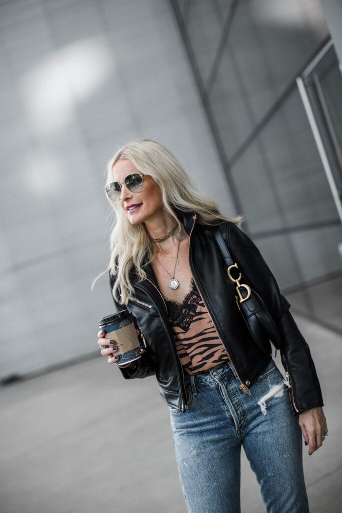 BLANKNYC JACKET WEARING A SIZE XS // ANIMAL PRINT CAMI WEARING A SIZE XS SIMILAR // AGOLDE JEANS WEARING A SIZE 24 // DIOR HANDBAG // CHRISTIAN LOUBOUTIN HEELS SIMILAR // GUCCI SUNGLASSES // DIOR CHOKER SIMILAR