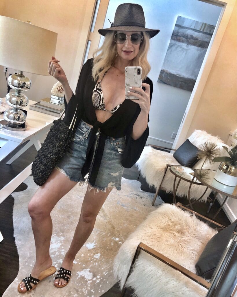 I wore this look to the pool on Memorial Day and got so many compliments on it. These denim shorts are my all time favorite cut-offs ever made! The fit is impeccable because they’re just a little bit longer than your typical pair of denim shorts making them very age appropriate and super flattering! I sized up one size, I’m wearing a size 26.