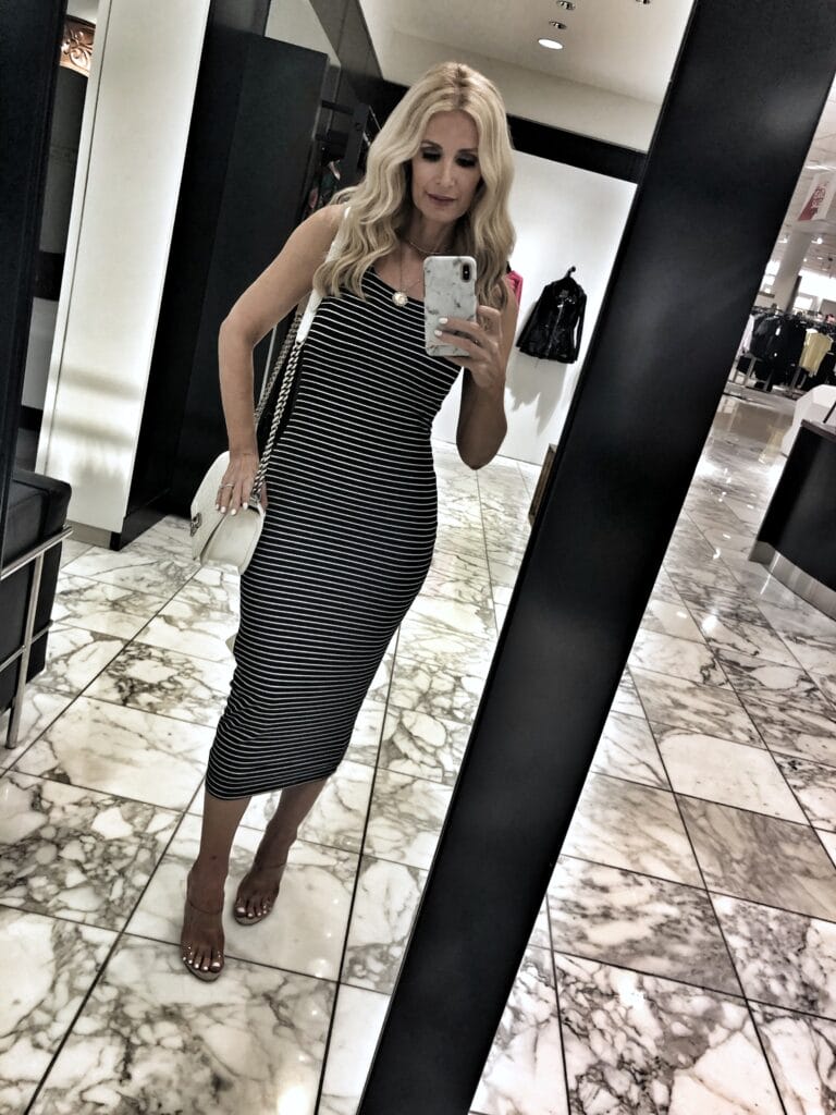 Good American jeans just came out with a line of fitted dresses and to say they are flattering would be an understatement! This super slimming midi dress is double lined and actually compresses your figure which is what makes is so slimming! It comes in 3 colors and would be so perfect for a date night or fun girl’s night out! I sized up one size and went with a size 1.