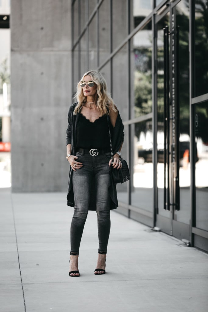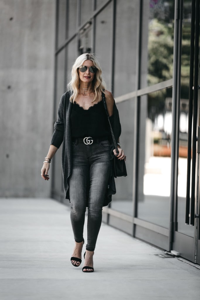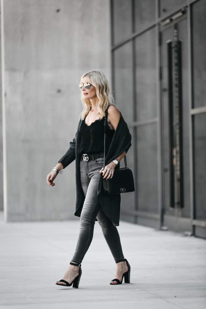 GRAY CARDIGAN // GRAY JEANS (UNDER $60) WEARING A SIZE 0 // DOLCE VITA STUDDED HEELS // SILVER CHOKER // BLACK CAMI SIMILAR