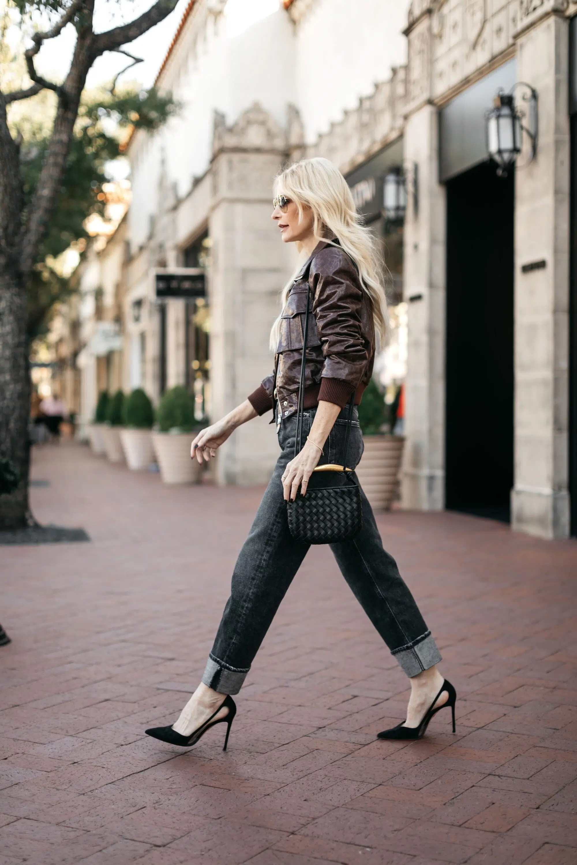 BROWN BOMBER JACKET (XS) // BODYSUIT (XS) // CUFFED JEANS (24) // HANDBAG – FOR LESS // HEELS