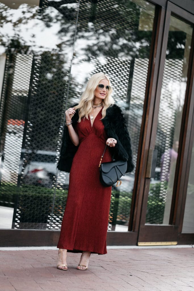 Finally, I styled mine more on the dressy side like Cathy by topping it with a glamorous black fur jacket by Alice and Olivia that I’m obsessed with! I love the cropped length and think this fabulous fur jacket would look so amazing paired with denim and boots as well. If this jacket is out of your budget, no worries, I linked another one that is a black faux fur jacket and it’s very similar yet a fraction of the price. I wore gold heels along with my gold layered necklaces which I love and literally wear them with everything! My look would be amazing to wear to a winter wedding, on a dressy date night, or even to a Sunday brunch.
