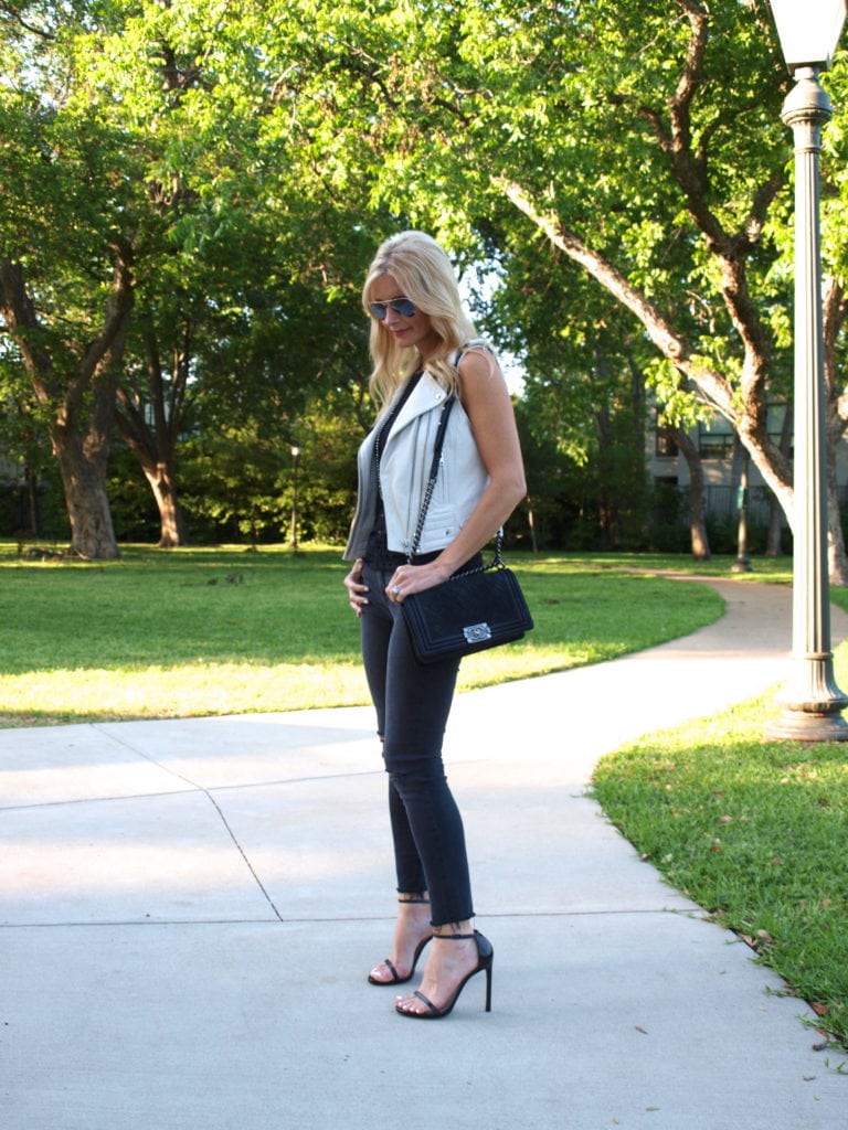 Wearing: White Leather Vest Old, similar here are here for less, J Brand Jeans, Stuart Weitzman Heels…(I won these!) for less here and here, Twenty Tee, Ray-Ban Sunnies, Chanel Boy Bag