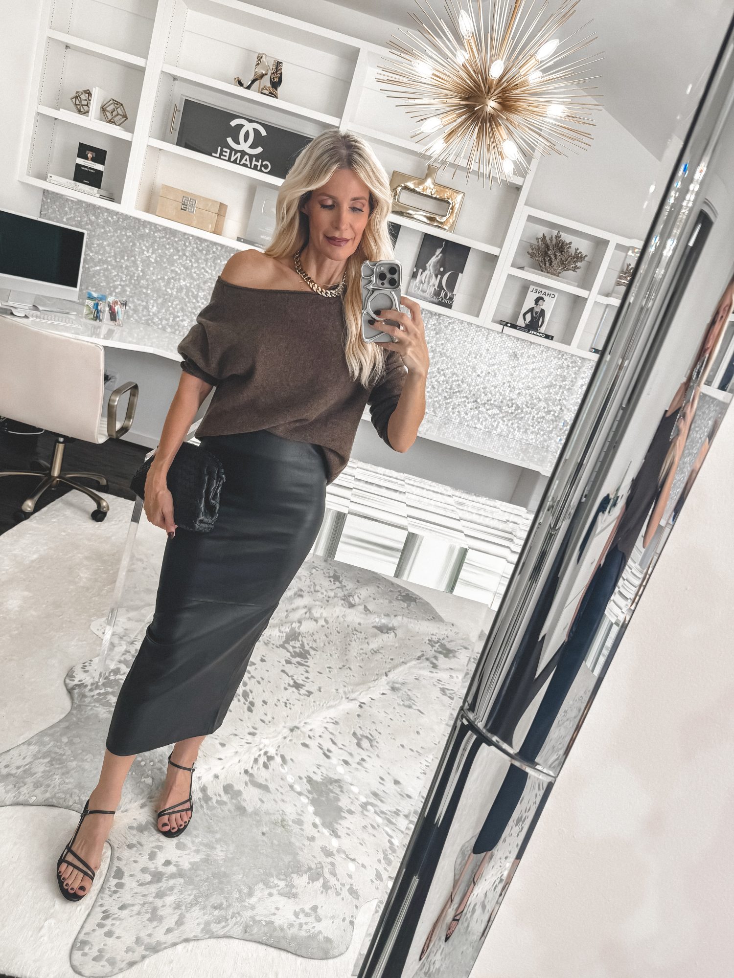 The leather midi skirt is having a major moment—chic, timeless, and ultra-flattering. I’m obsessed with this black leather pencil skirt from Quince; the fit is sleek and structured, giving you instant confidence. I paired it with the same brown cashmere sweater, black heels, and a woven bag for a sophisticated neutral look that transitions from the office to dinner. I’m wearing an XS in both pieces, and would stick with your regular size for the best fit.