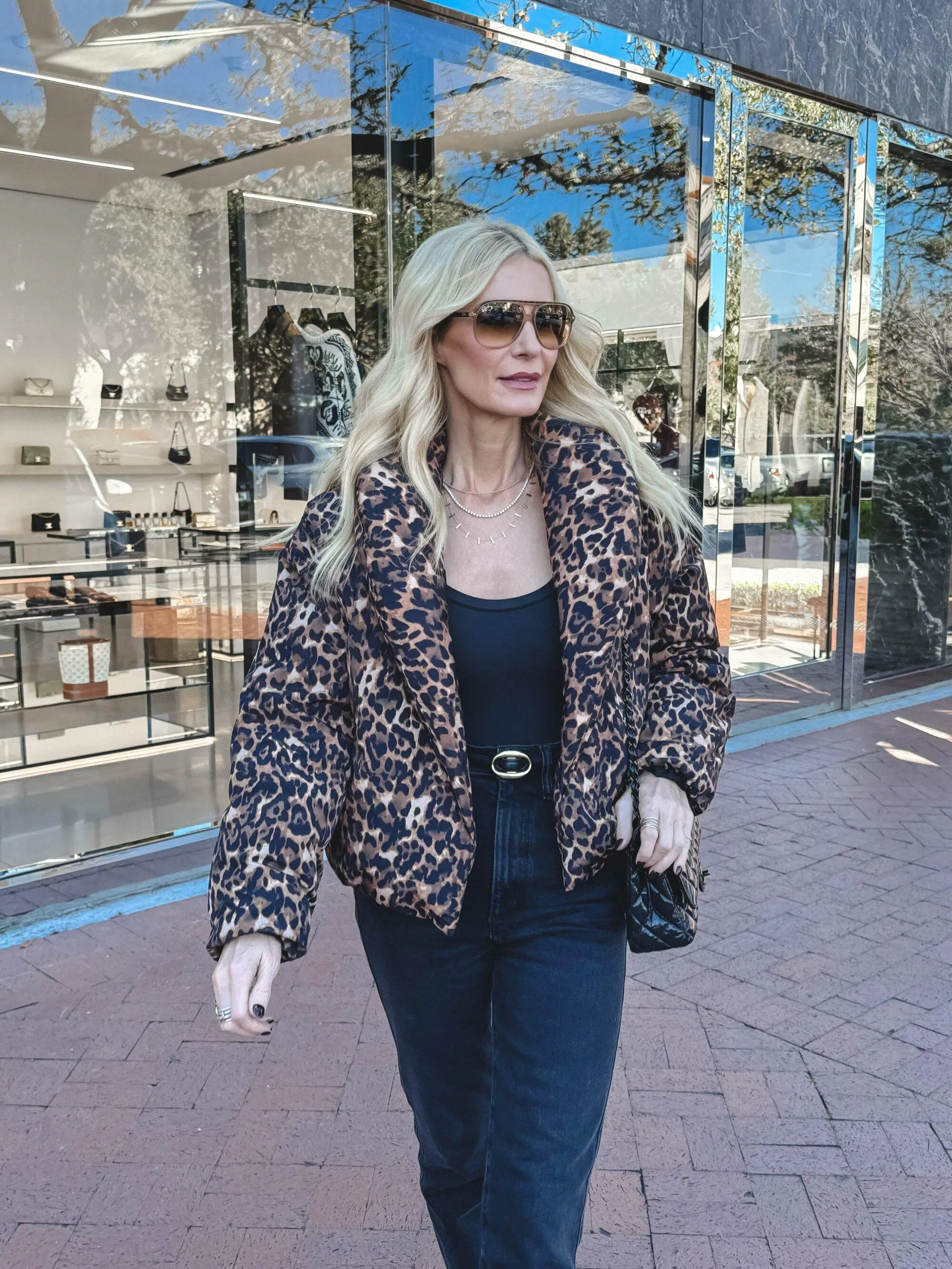 LEOPARD PUFFER JACKET (XS) // BODYSUIT (XS) // STRAIGHT LEG JEANS (24) // BOOTIES // HANDBAG – FOR LESS