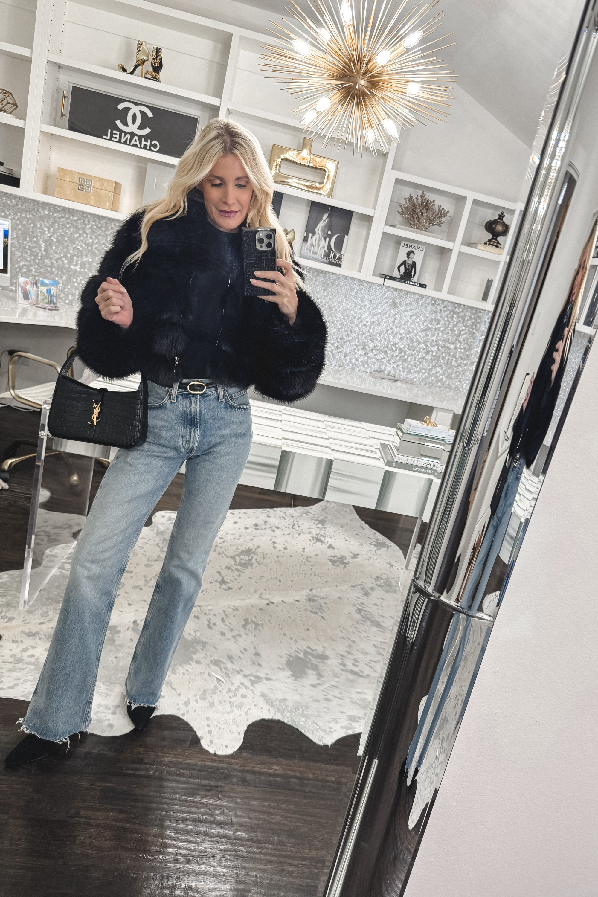 FAUX FUR JACKET (XS) // BODYSUIT (XS) // JEANS (24) // METALLIC HEELS // HANDBAG